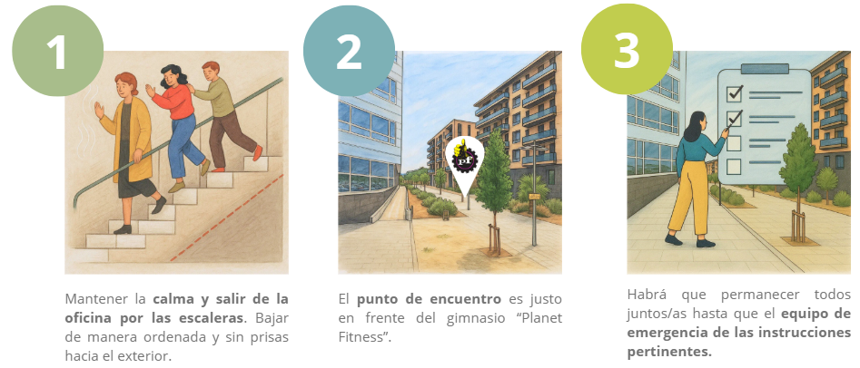 Para garantizar la seguridad de todas las personas trabajadoras, a continuación encontrarás las pautas del PLAN DE EVACUACIÓN en caso de que suene la alarma de incendio del edificio. En el caso en que haya humo denso en las escaleras, cerraremos las puertas ignífugas y esperaremos a que acudan los bomberos a despejar la salida de manera segura. Ante cualquier consulta, puedes dirigirte al Equipo de Emergencia.